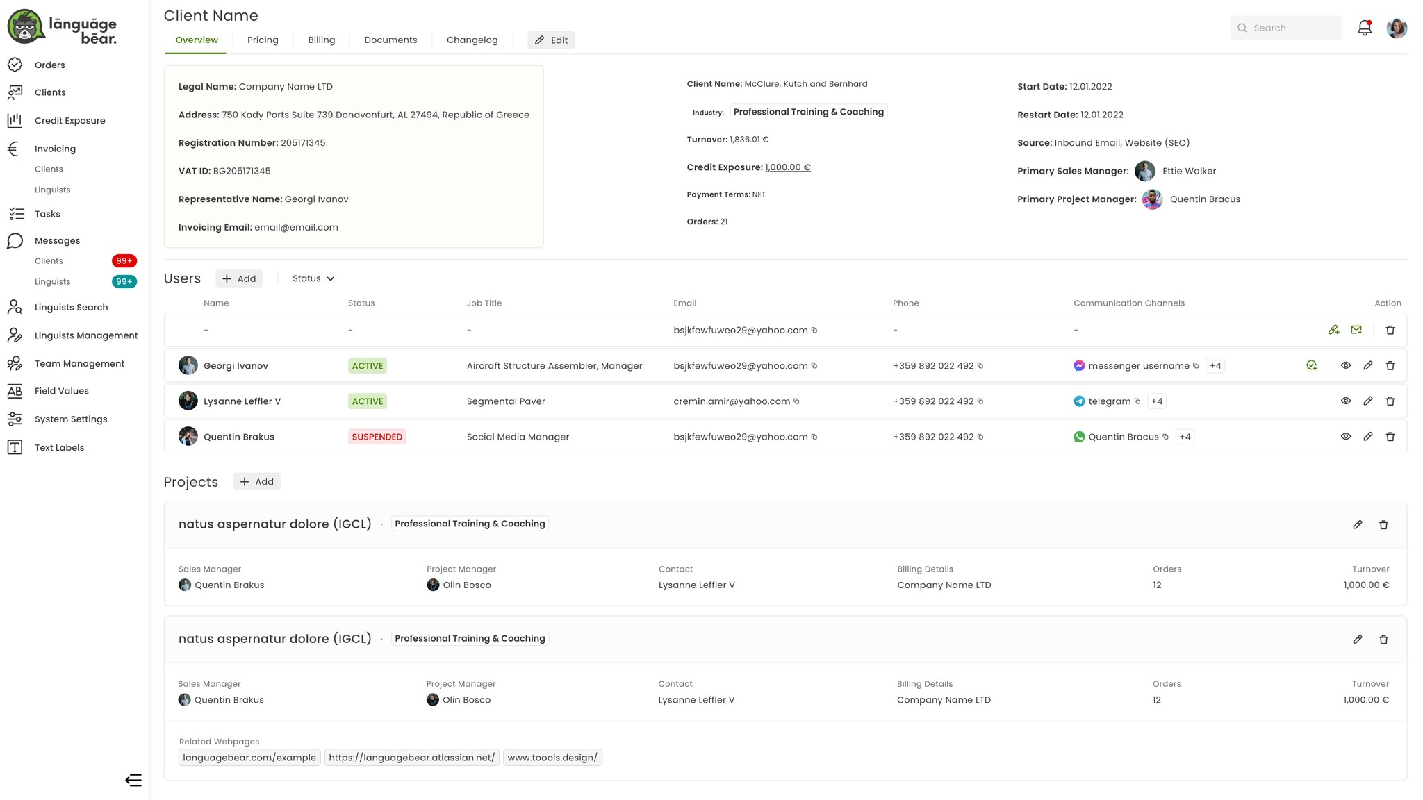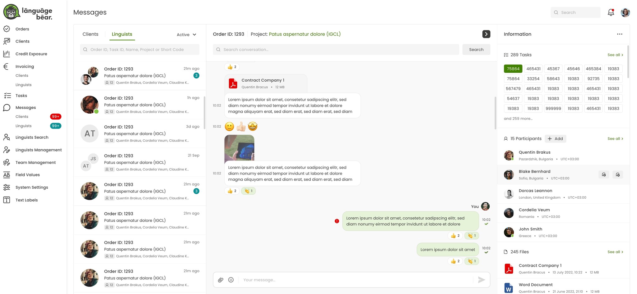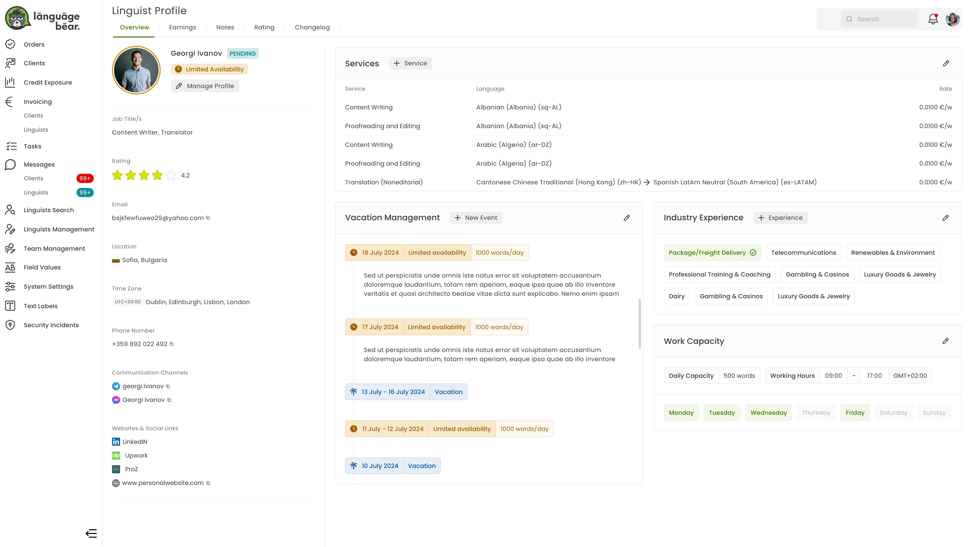 Solution: I designed the profile page, which highlights services, languages, availability, vacation dates with capacity limits, industry experience, rating, and daily work capacity. This allows managers to get quick insights into a linguist's capabilities and schedule.