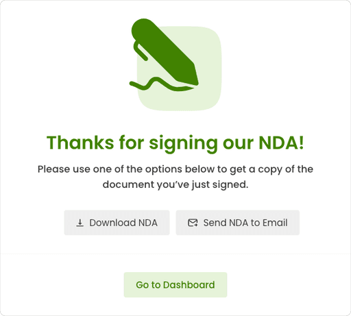 NDA Security flow that guides users through the process of signing a Non-Disclosure Agreement (NDA) electronically. This ensures that users understand and agree to the terms of confidentiality and will not spread sensitive information.