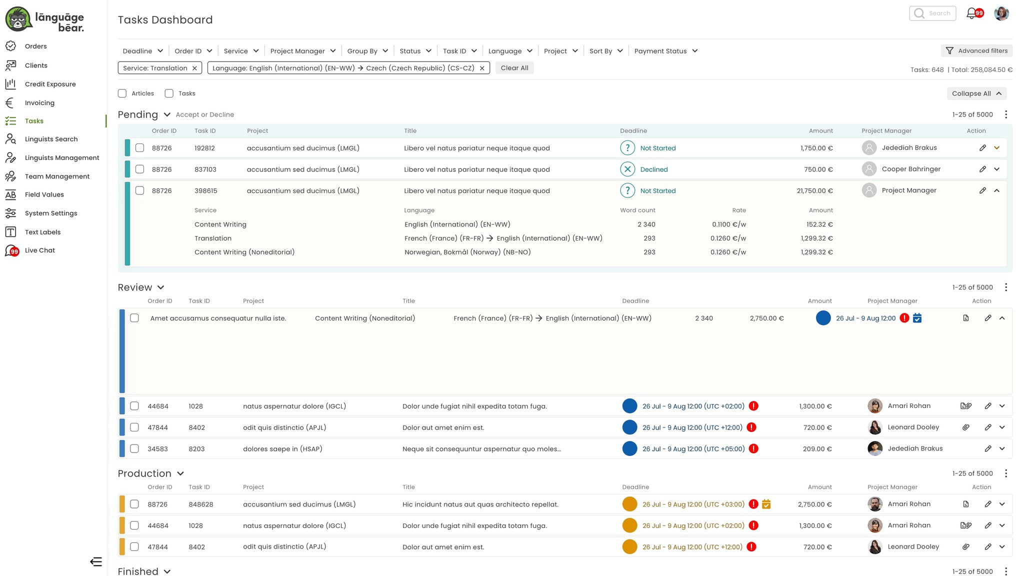 Solution: Creating an organized layout that categorizes tasks into sections: Pending, Review, Production, and Finished. To improve task discovery, advanced filtering options such as deadline, task ID, language, and payment status were needed. Visual clarity was achieved by introducing color-coded status indicators like “Not Started,” “Declined,” and “In Progress”. Additionally, I incorporated visual cues like deadlines, alerts, and icons to highlight critical tasks, ensuring priorities are recognizable fast.