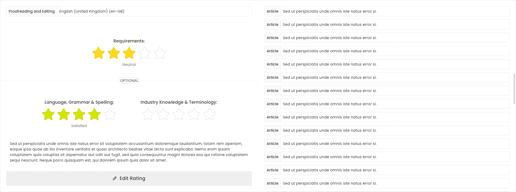Solution: Introduced a rating page that focuses on key performance indicators. It includes ratings for meeting project requirements, language, grammar, spelling, and industry terminology knowledge. Each criterion is rated with stars, providing a clear, visual representation of the writer's or translator's skills.